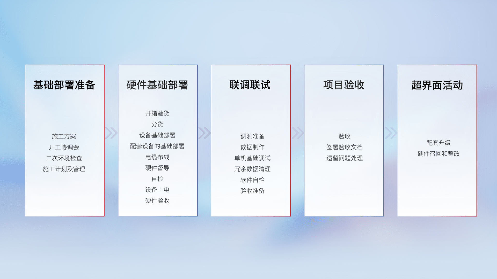 从基础部署准备、、硬件基础部署、、、、联调联试、、项目验收、、、、越界面活动的全过程可追溯,,,,保证施工质量和进度。。