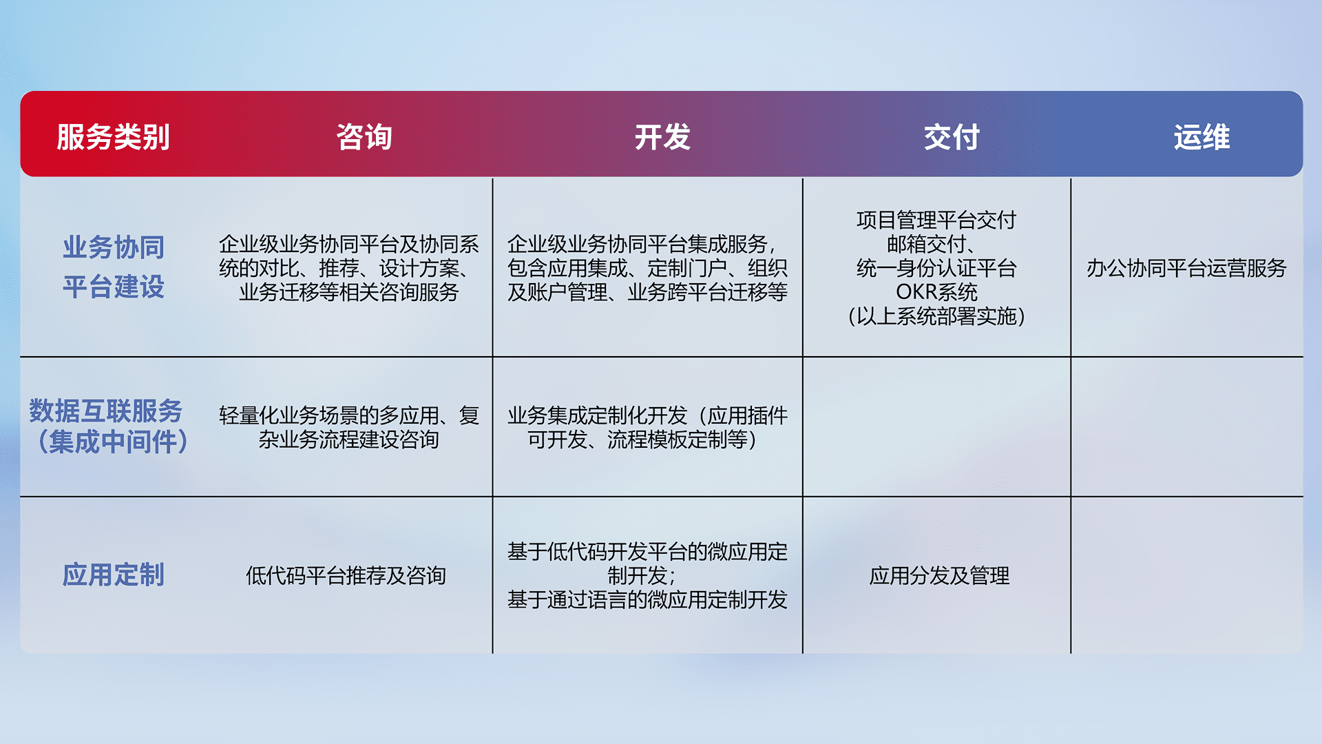 针对钉钉、、、、企微、、、IDaas等平台级产品提供产品的规划、、方案、、、、交付、、定制化开发等服务,,,实现如统一协同办公、、、、智能客户服务、、、、混合会议管理、、、智能数据查询、、、、等业务场景,,,,实现数字化转型。。。
